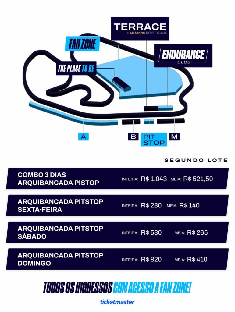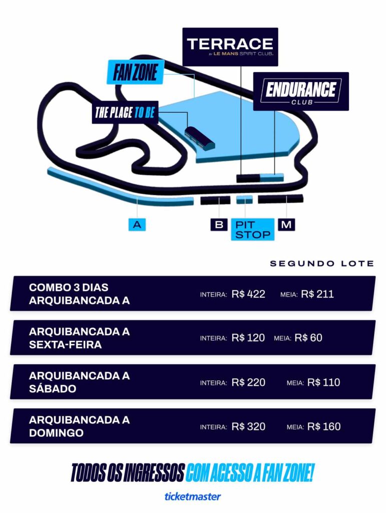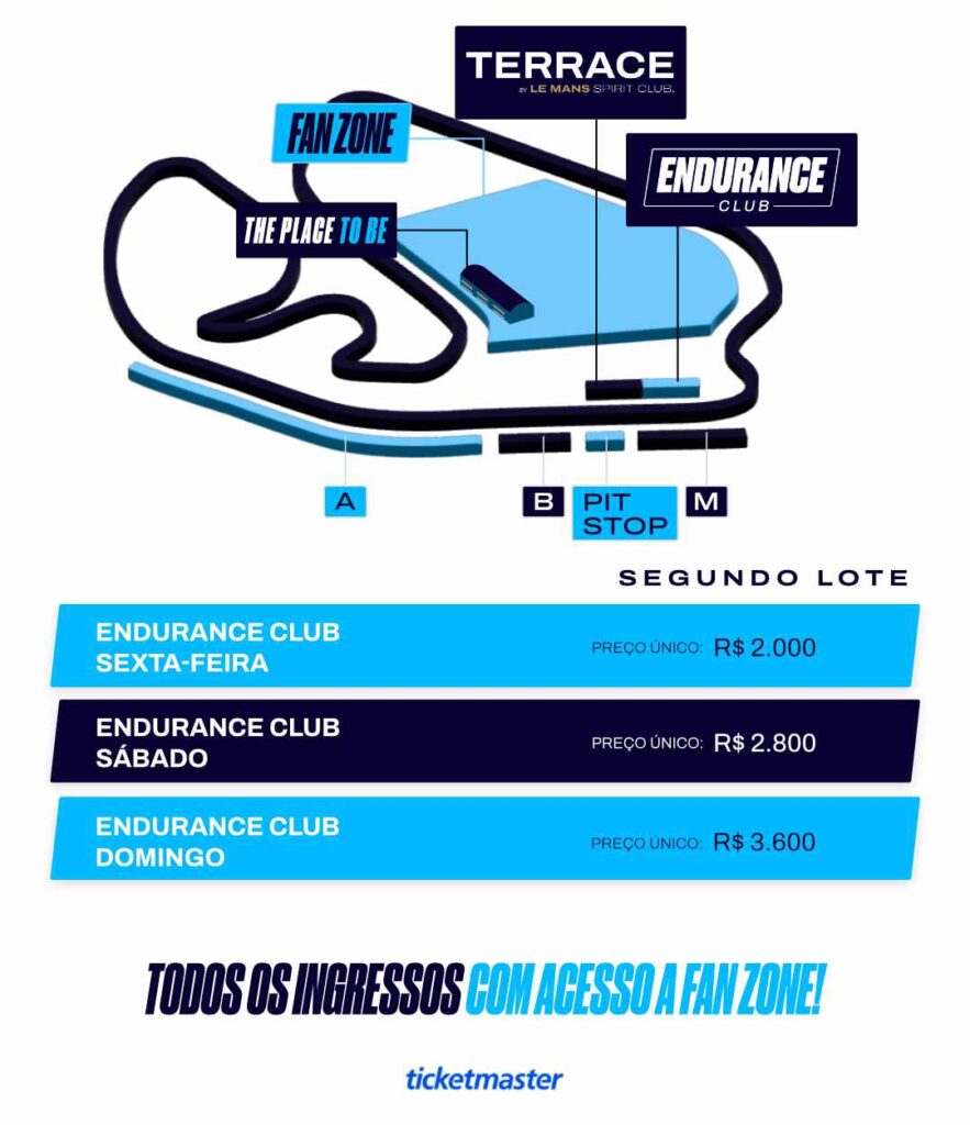 Todos os ingressos para arquibancadas e áreas VIP incluem acesso à Fan Zone, que pode ser visitada a qualquer momento durante o evento. A Fan Zone é o espaço de entretenimento dos eventos do FIA WEC, onde você encontra lojas oficiais, roda gigante, simuladores de corrida, shows musicais e outras atrações. É possível assistir à corrida em telões espalhados pelo local.