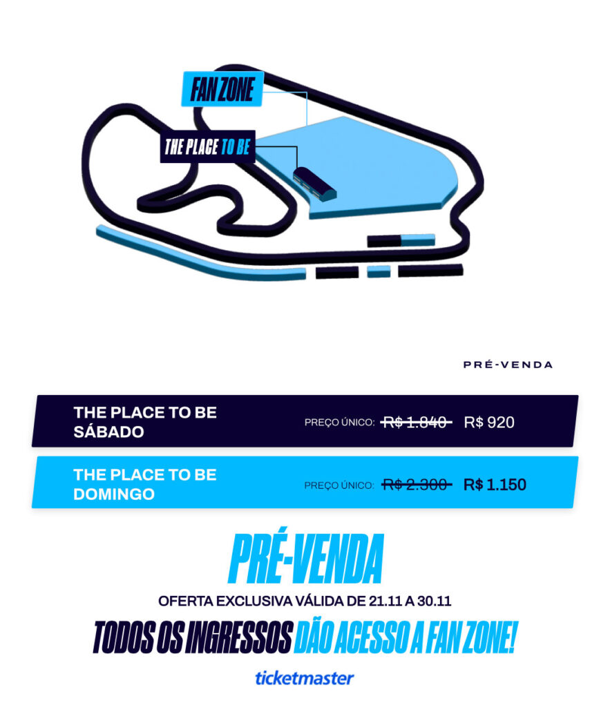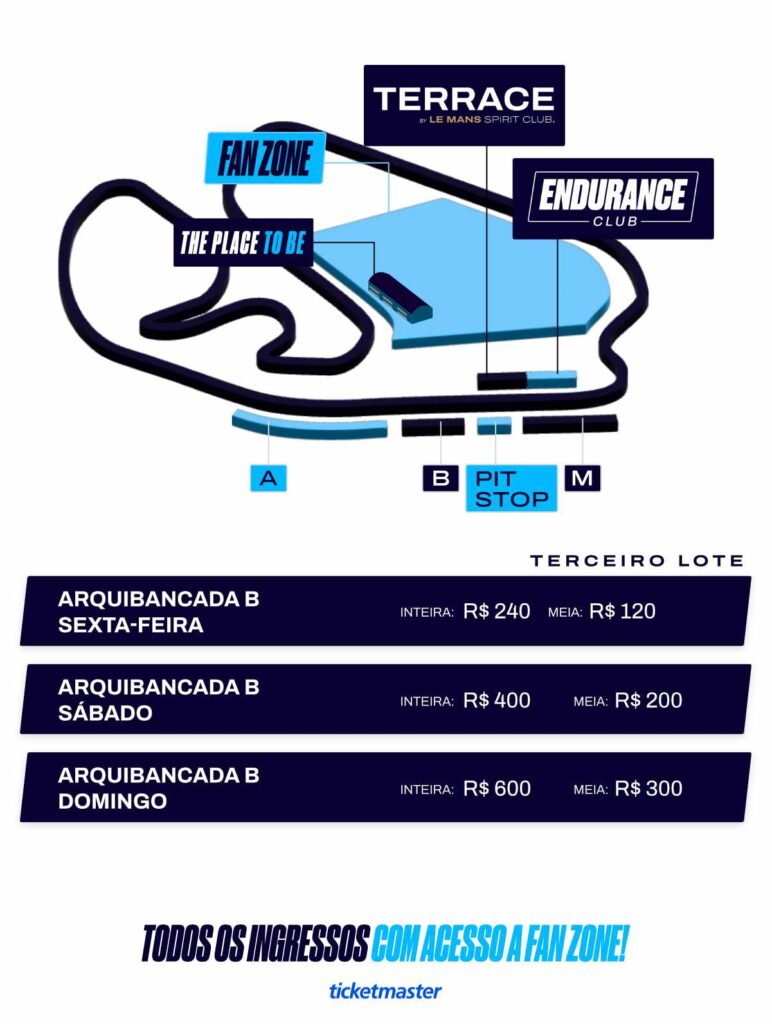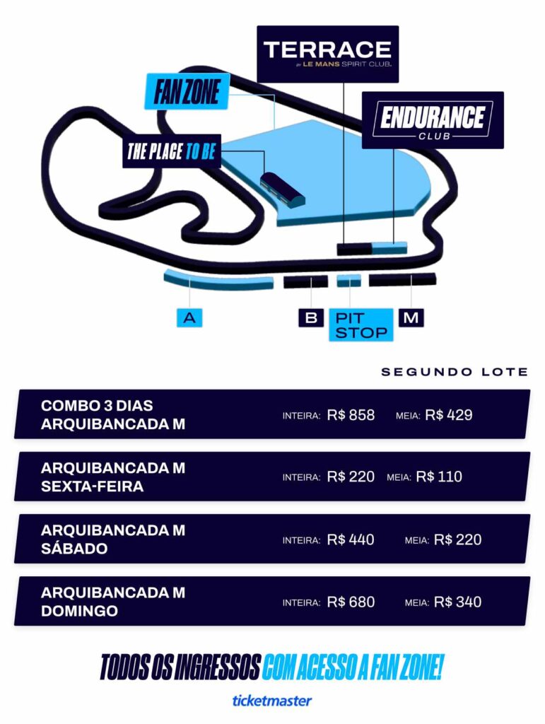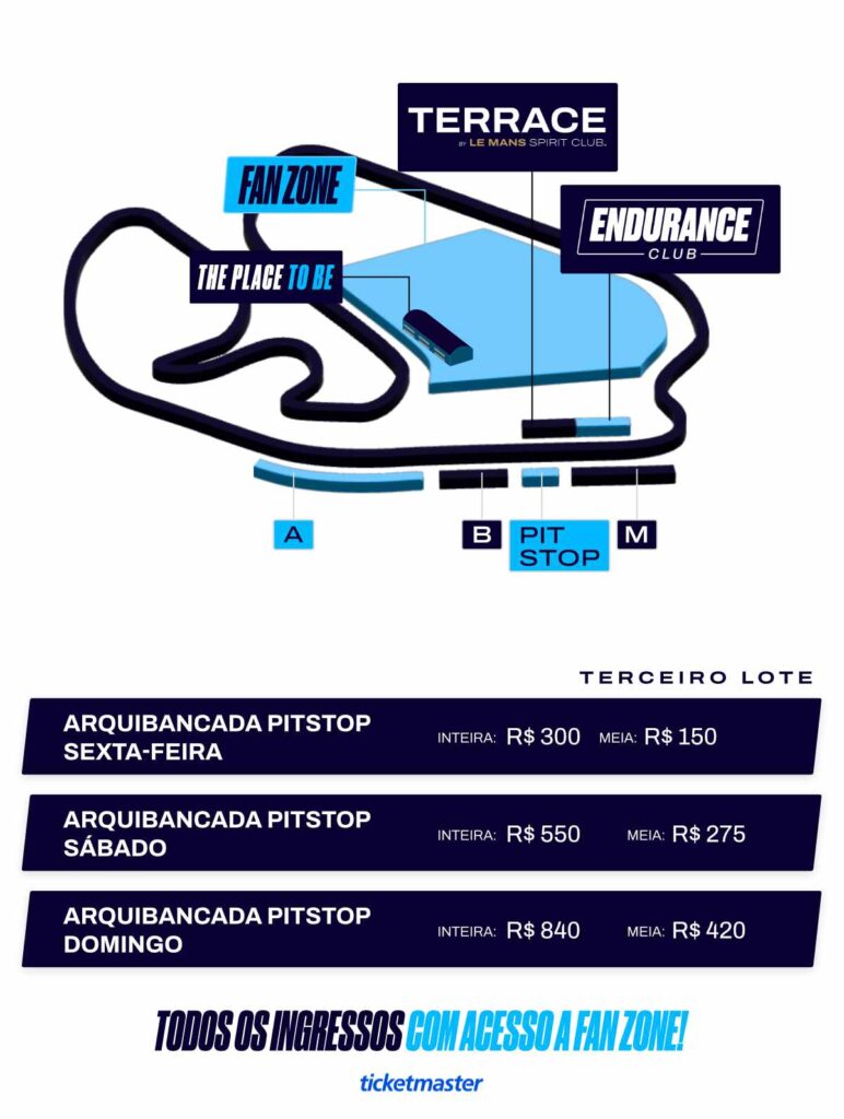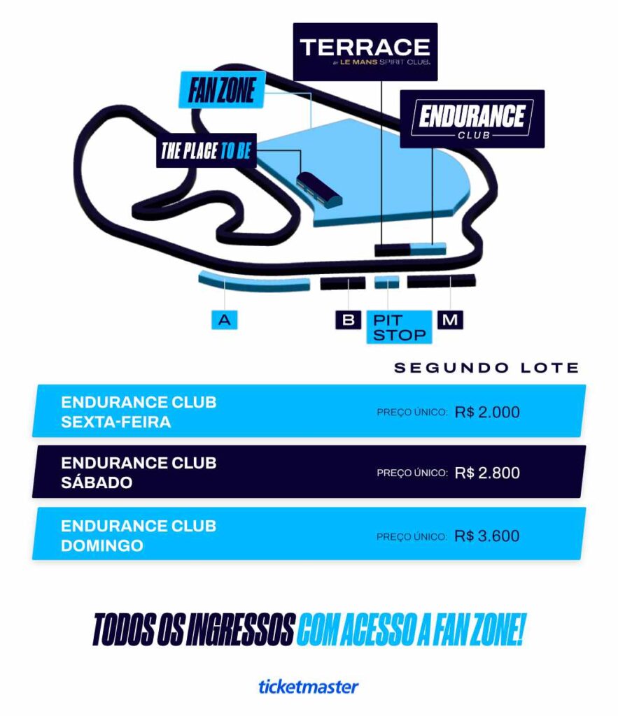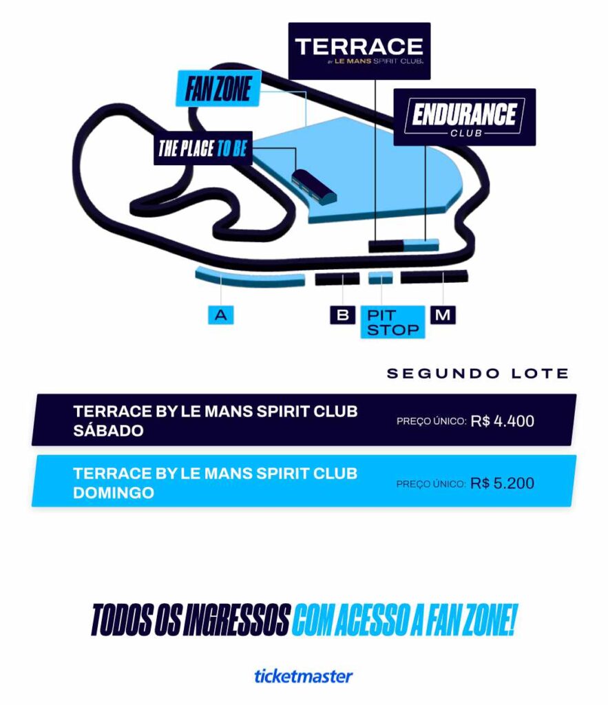 Todos os ingressos para arquibancadas e áreas VIP incluem acesso à Fan Zone, que pode ser visitada a qualquer momento durante o evento. A Fan Zone é o espaço de entretenimento dos eventos do FIA WEC, onde você encontra lojas oficiais, roda gigante, simuladores de corrida, shows musicais e outras atrações. É possível assistir à corrida em telões espalhados pelo local.